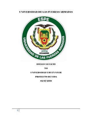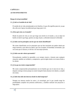 Este documento presenta un resumen autobiográfico de Diego Calvachi. Describe su personalidad, valores, intereses, éxitos y fracasos. Presenta su árbol genealógico y breve autobiografía. También establece su misión, visión, objetivos y metas personales para el futuro, así como su compromiso de luchar por alcanzar sus sueños y ser una persona de bien.