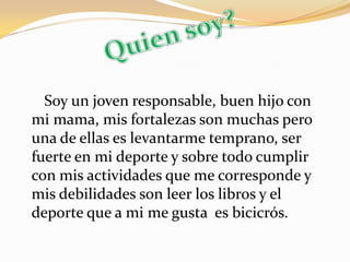 Edison Orlando Marín Suárez, un estudiante de séptimo grado, describe su proyecto de vida. Planea convertirse en un gran deportista en los próximos 5 años y estudiar ingeniería mecánica automotriz o diseño industrial en la universidad. Más adelante, quiere trabajar y apoyar económicamente a su madre. Para lograr sus metas, necesita practicar mucho su deporte favorito, el bicicrós, y esforzarse en sus estudios.