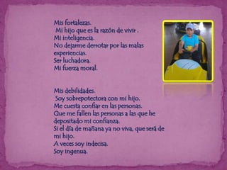 Este documento describe las fortalezas y debilidades de la autora, incluyendo su hijo, inteligencia y fuerza moral como fortalezas, y ser sobreprotectora e ingenua como debilidades. También detalla cómo sus padres influyeron en su vida y sus sueños de convertirse en profesional para darle un buen futuro a su hijo.