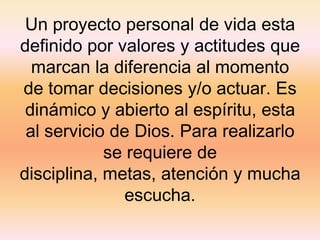 Este documento presenta el proyecto de vida de Manuela Stuppini, una estudiante de 11° grado. Describe sus fortalezas, debilidades, intereses, metas e influencias. Su objetivo principal es graduarse de odontología, especializarse, trabajar en el exterior y ser reconocida internacionalmente en su carrera. Para lograrlo, se enfocará en mejorar su rendimiento académico y relacionarse con expertos en odontología. Evaluará su progreso trimestralmente.