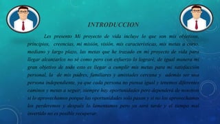 Este documento presenta el proyecto de vida de Javier José Lorenzo Gil, un estudiante de 28 años que está terminando su carrera de abogado. Su proyecto incluye sus objetivos, principios, metas a corto, mediano y largo plazo, así como una autobiografía, misión, visión y valores fundamentales. Su visión es tener una vida plena con una carrera exitosa para apoyar a su familia.