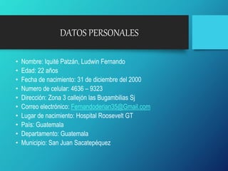 Este documento presenta el proyecto de vida de Ludwin Fernando Iquité Patzán, un joven de 22 años. Incluye información personal, metas educativas y laborales a corto y largo plazo, así como características físicas, mentales y emocionales. El objetivo general es graduarse este año para continuar estudios universitarios y encontrar un trabajo estable que le permita devolver a sus padres su apoyo.