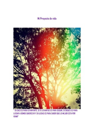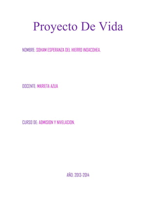 Este documento presenta el proyecto de vida de Soham Esperanza del Hierro Indacochea. Su visión es convertirse en una laboratorista clínica profesional con valores éticos que ayude a los demás. Actualmente se encuentra estudiando para ingresar a la universidad y desea viajar a Argentina para realizar una maestría. Su misión es terminar sus estudios, trabajar para apoyar a su familia y convertirse en una mejor persona cada día.