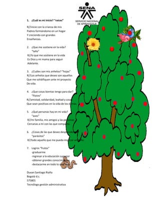 El documento resume la vida de una persona a través de siete preguntas que representan diferentes partes de un árbol. La persona describe que sus raíces son su crianza por sus padres, que Dios y su madre la sostienen en la vida como su tallo, y que sus anhelos son solidificar su proyecto de vida como las hojas. Planea dar amistad y lealtad a los demás como las flores, y considera a su familia y amigos como las aves en su vida. Desea desprenderse de todo lo que pueda causarle daño como los parásit