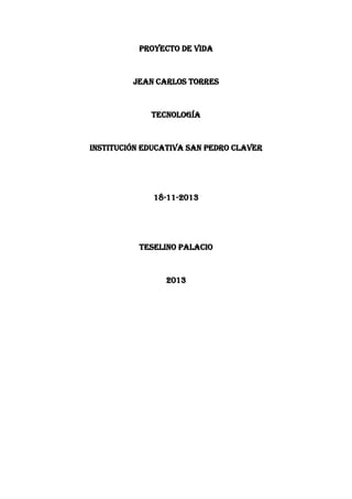 Jean Carlos Torres presenta su proyecto de vida en el que describe sus fortalezas, debilidades, sueños e intereses. Planea estudiar medicina para convertirse en un profesional respetuoso y honesto, con el apoyo de su familia. Identifica algunos obstáculos como la pereza pero planea superarlos a través del estudio para lograr sus objetivos.