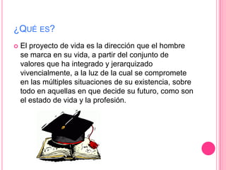 El documento presenta la información sobre un proyecto de vida realizado por estudiantes de grado 701. Explica que un proyecto de vida es la dirección que una persona se marca basada en sus valores para guiar sus decisiones de vida. Los objetivos son conocer las bases para construir un proyecto de vida y promover una sana aceptación de uno mismo. Además, detalla que un proyecto de vida sirve para orientar el camino de una persona mediante metas y sueños que se van actualizando a lo largo de la vida.