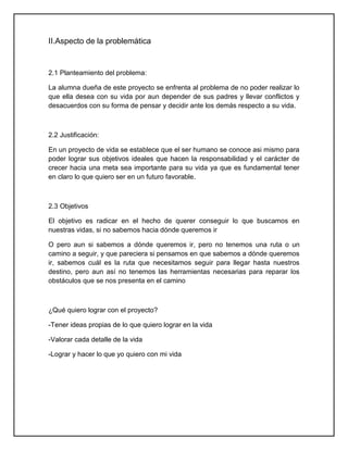 Este documento presenta el proyecto de vida de Crisanta Farro Lisseth Beatriz. Describe su situación actual y su dependencia de sus padres, y establece objetivos como tener ideas propias sobre su vida y lograr lo que quiere. Incluye un autodiagnóstico de sus fortalezas, debilidades, intereses, éxitos y fracasos. También analiza sus condiciones facilitadoras y obstaculizadoras para el desarrollo, y establece un plan de acción para tomar decisiones propias y sentirse satisfecha.