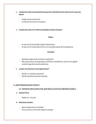 Este documento presenta el proyecto de vida de una persona. Ella analiza sus fortalezas y debilidades, las personas e influencias clave en su vida, sus intereses y metas educativas y profesionales. También reflexiona sobre su personalidad, sueños y cómo superar los obstáculos para lograr sus objetivos de convertirse en ingeniera mecánica e industrial y formar una familia a través del esfuerzo y apoyo de sus seres queridos.