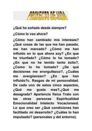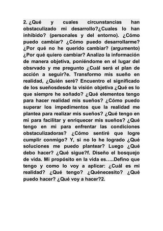 Este documento explora las reflexiones de una persona sobre su pasado, presente y futuro. Se analizan los intereses, logros, fracasos, rasgos de personalidad, sueños y circunstancias que han facilitado u obstaculizado su desarrollo. Finalmente, la persona diseñará un bosquejo de vida que defina su propósito y cómo aplicará sus habilidades y recursos para alcanzar sus sueños a pesar de los impedimentos.