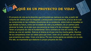 Este documento trata sobre la importancia de tener un proyecto de vida. Un proyecto de vida nos permite establecer metas y objetivos claros que nos guíen hacia su cumplimiento, evitando así vivir sin rumbo. Incluye la historia de Carlos, un niño que logró cumplir su sueño de tener una casa grande a pesar de las dificultades, demostrando que el esfuerzo y la perseverancia son claves para alcanzar los sueños. Finalmente, se presentan pasos para elaborar un proyecto de vida propio estableciendo metas