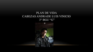 Este documento es un plan de vida de un estudiante ecuatoriano llamado Luis Vinicio Cabezas Andrade. El plan describe sus objetivos de estudiar una carrera universitaria para ayudar a sus padres, sus fortalezas como la puntualidad y debilidades como la baja autoestima, y su plan de acción para cumplir sus metas a corto, mediano y largo plazo a través de la dedicación, esfuerzo y superación personal.