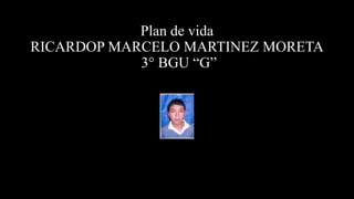 Este documento presenta el plan de vida de Ricardo Marcelo Martínez Moreta de la tercera promoción del colegio Luciano Andrade Marín. Ricardo detalla sus objetivos, fortalezas, debilidades y las personas que lo han influenciado. Explica que quiere estudiar una carrera universitaria para tener una profesión y ayudar a sus padres. Para lograr esto, necesita superar sus debilidades y dedicarse a estudiar mucho con el apoyo de su familia. Su propósito final es seguir adelante y convertirse en un profesional.