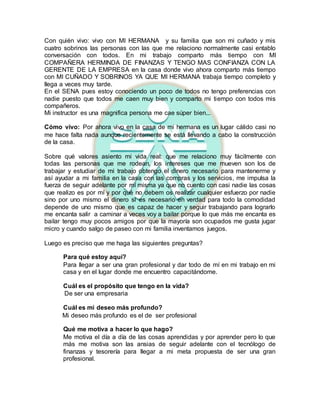 La autora proviene de una familia humilde y busca capacitarse en contaduría a través del SENA para lograr su meta de convertirse en una profesional. Actualmente trabaja medio tiempo y vive con su hermana y familia. A pesar de enfrentar dificultades como ser explosiva e impulsiva, se motiva a seguir estudiando para alcanzar sus objetivos a futuro.
