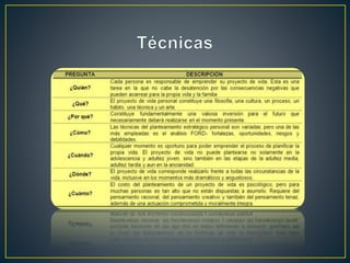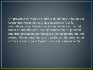 Este documento describe los elementos clave de un proyecto de vida efectivo. Explica que un proyecto de vida implica conocerse a sí mismo y plantear objetivos alcanzables. También destaca la importancia de aprovechar las cualidades personales, establecer metas claras, y mantener una visión positiva a pesar de los desafíos. El documento enfatiza que cada persona es responsable de crear su propia existencia mediante la toma de decisiones, el compromiso con los demás, y esforzándose por alcanzar su máximo potencial.