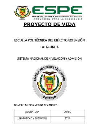 Este documento presenta el proyecto de vida de Ney Andres Medina Medina. En él, Ney describe sus valores fundamentales como la lealtad, la amistad y el amor. Explica que su objetivo es dejar un legado positivo que ayude a las personas y mejore la calidad de vida de su familia. También detalla eventos que lo han influenciado como el apoyo incondicional de su madre. Su principal interés desde temprana edad ha sido marcar un antes y un después en la historia.