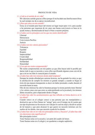 Este documento presenta el proyecto de vida de una persona. Detalla sus principios y valores como la libertad, democracia y honestidad. Sus objetivos incluyen obtener un título universitario, viajar, y ver a su hermano cumplir sus sueños. Establece metas a corto y mediano plazo para alcanzar sus aspiraciones a través de la educación y el apoyo a su familia.