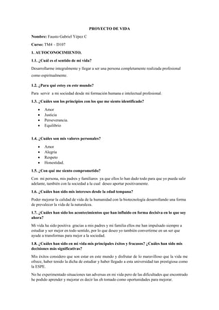Este documento presenta el proyecto de vida de Fausto Gabriel Yépez C, estudiante de la carrera de TM4 - D107. El proyecto incluye una sección de autoconocimiento en la que reflexiona sobre sus valores, intereses e influencias. También establece su misión personal de convertirse en un profesional que aporte valor a la sociedad y dé orgullo a su familia. Finalmente, formula estrategias y establece metas para 2016-2019 para lograr sus objetivos académicos y personales.