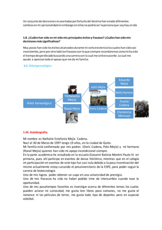 Este documento presenta el proyecto de vida de Nathalie Mejía. Ella realiza una reflexión sobre su autoconocimiento, sus valores, intereses y experiencias de vida. También establece su misión personal de ayudar a otros de manera significativa y sus sueños de crear cosas valiosas y conocer el mundo. Finalmente, formula estrategias y objetivos a corto, mediano y largo plazo para lograr sus metas educativas y profesionales.