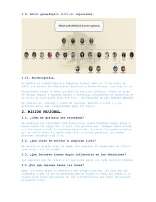 Este documento presenta el proyecto de vida de Lizeth Gabriela Espinosa Alvear. Ella realiza un autoanálisis para determinar su sentido de vida, valores, intereses, éxitos y fracasos. Su familia es su principal motivación y su misión es estudiar Ingeniería en Sistemas para brindarles un mejor futuro a ellos. Ella se compromete a ser una buena persona, ayudar a los demás y aprender de sus errores.