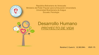 Este documento presenta el proyecto de vida de Roraima C. Cuare A., que incluye su visión de ser una mujer profesional íntegra capaz de transformar vidas, su misión de crear un entorno más justo a través de su testimonio, y metas como mejorar su salud, aumentar sus ingresos, aprender un nuevo idioma, graduarse como psicóloga y escribir un libro, junto con planes para lograr estas metas a partir de agosto de 2016 hasta diciembre de 2020 en otro país con determinación y apoyo divino