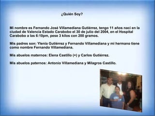 Este documento presenta el proyecto de vida de Fernando José Villamediana Gutiérrez, un estudiante de 11 años que asiste a la Escuela Básica Bolivariana “Eleazar Beracierto” en Valencia, Venezuela. Su proyecto de vida incluye ser un beisbolista profesional, graduarse de la universidad, conocer muchos países, lograr la paz en Venezuela y ayudar a su familia. Describe sus fortalezas como su familia, salud y amigos, así como sus debilidades y amenazas.