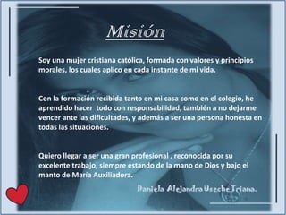 La autora describe su misión y visión de convertirse en una profesional reconocida en cardiología aplicando los valores cristianos y salesianos que aprendió. Actualmente estudia medicina con el apoyo de su familia y su fe en Dios. Su objetivo es ejercer su carrera ayudando a otros y honrando a sus padres.