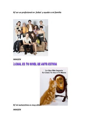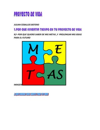 Este documento presenta las metas y aspiraciones de Julian Ceballos Botero. Julian quiere ser un profesional en fútbol para ayudar a su familia. Identifica sus fortalezas como buen estudiante, optimista, solidario, activo y honesto. Sus metas a corto y largo plazo incluyen ser un buen estudiante, pasar la universidad, convertirse en un profesional de natación en 10 años. Cree que para lograr las metas se necesita tener autoestima, establecer metas claras y utilizar las propi