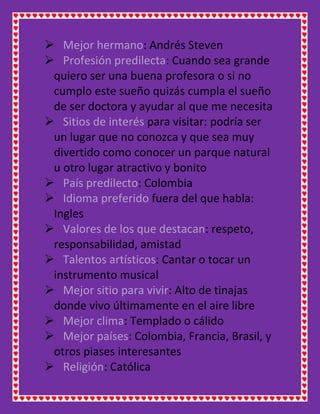 Nombre: Luisa FernandaPalma Castañeda<br />Lugar de nacimiento: Bello<br />Fecha de nacimiento:22 de junio de 1999<br />Nombre de los padres: Alberto Palma M<br />Números de hermanos:2<br />Institución donde estudias: I.E.T.I. SIMONA DUQUE <br />Signo zodiacal: Cáncer<br />Color favorito: <br />Entretenimiento preferido: televisión<br />Mejor profesor: Andrés Ospina<br />Mejor amigo o amiga: Jessica Vanesa<br />Mejor hermano: Andrés Steven<br />Profesión predilecta: Cuando sea grande quiero ser una buena profesora o si no cumplo este sueño quizás cumpla el sueño de ser doctora y ayudar al que me necesita<br />Sitios de interés para visitar: podría ser un lugar que no conozca y que sea muy divertido como conocer un parque natural u otro lugar atractivo y bonito<br />País predilecto: Colombia<br />Idioma preferido fuera del que habla: Ingles<br />Valores de los que destacan: respeto, responsabilidad, amistad<br />Talentos artísticos: Cantar o tocar un instrumento musical<br />Mejor sitio para vivir: Alto de tinajas donde vivo últimamente en el aire libre<br />Mejor clima: Templado o cálido<br />Mejor países: Colombia, Francia, Brasil, y otros piases interesantes<br />Religión: Católica<br />Creencias: Dios, y la religión católica<br />Comidas preferidas: El sancocho y ensalada de frutas <br />Bebida preferidas: jugos naturales <br />Un árbol: Pino<br />Un libro: Mi amigo el pintor<br />Un objeto: Computador<br />Una flor: Rosa<br />Una canción: Tu nombre en mi cuaderno<br />Una idea: tener una buena familia y vivir como siempre lo he soñado y tener un buen trabajo muy cumplir mi mayor sueño ser una buena profesora para ayudar a la comunidad en general del futuro<br />¿Qué esta haciendo para al alcanzar su profesión preferida?<br />Estudiar y ser responsable también en un futuro entre a la universidad si mis papas tienen recursos para hacerlo además haré mas practicas ayudare a los demás y después <br />Donde y cuando nacieron tus padres?<br />Mi madre nació en Marinilla por medio de una partera de el barrio de la dalia ella nació el 5 de diciembre de 1968<br />Mi padre nació en Tado por medio de una partera el nació el 26 de febrero de 1975<br /> <br />Ellos se conocieron aquí en Marinilla en una salida a una cafetería se hicieron buenos amigos y luego resultaron en noviazgo todo esto sucedió porque mi abuelo y mi mama frecuentaban en este lugar.<br /> <br />Quienes conforman mi familia son 3 tíos y 5 tías a quienes quiero mucho, tengo también 12 primos con quienes comparto alegrías y tristezas y por último a una hermanita llamada Luisa a quien quiero y quien comparto a diario. Ha también tengo un hermano ya mayor que no vive en la ciudad.<br /> <br />Mi nacimiento:yo naci el 22 de junio de 1999 en el hospitalvictor cardena mi prime año lo comparti con mi hermano y con mis padres<br />Mi bautizo: Mi bautizo fue en los días de noviembre mis padrinos fueron dos tíos de mi papa en la iglesia de María auxiliadora me bautizaron con el nombre Luisa Fernanda.<br /> <br /> <br />Mis primeros disfraces:<br />El primer año me disfrazaron de muñeca<br />El segundo año me disfrazaron de campesina <br />Y por ultimo de flor<br />Mi estudio: mis primeros pasos en el estudio se dieron en el jardín integral donde estudie con el apoyo de mis padres, compañeros y profesoras. <br />Después de graduarme en el jardín pase ala primaria<br /> a la escuela donde pude adquirir nuevos conocimientos y conseguir mis primeros amigos. Estudio en la IETI Simona Duque donde estudio 6º<br /> <br />En estos momentos estoy cursando el grado 6° estoy muy feliz con la vida que llevo, tengo varios amigos, tengo una familia genial y unos padres que me han dado todo su apoyo para yo poder seguir adelante con lo que tengo y prepararme para un futuro bien planeado<br /> <br />Aunque no se como lo tenga planeado DIOS pero yo quisiera tener en mi futuro: <br />Entre de 5 años: Si Dios quiere estaré en la universidad estudiando pedagogía para poder volverme en un buen profesor y ayudar a los demás a salir a delante <br />Entro de 15 años: estaré enseñando en un colegio a estudiantes que quieren salir adelante y ayudar a las personas que lo necesitan y que con mi ayuda salgan a vivir en un mundo mejor, también pensare en buscar a una mujer que me haga feliz. <br />Entro de 30 años: encontrare la manera de convertirme en un profesor muy bueno que ayude a los demás a buscar su futuro y ayudar en su desarrollo, también buscare a la mujer que me feliz el resto de mi vida y buscar con ella a conformar una familia y vivir felices hasta que DIOS me lo permita pero antes conseguir mi mayor sueño de:<br /> <br />