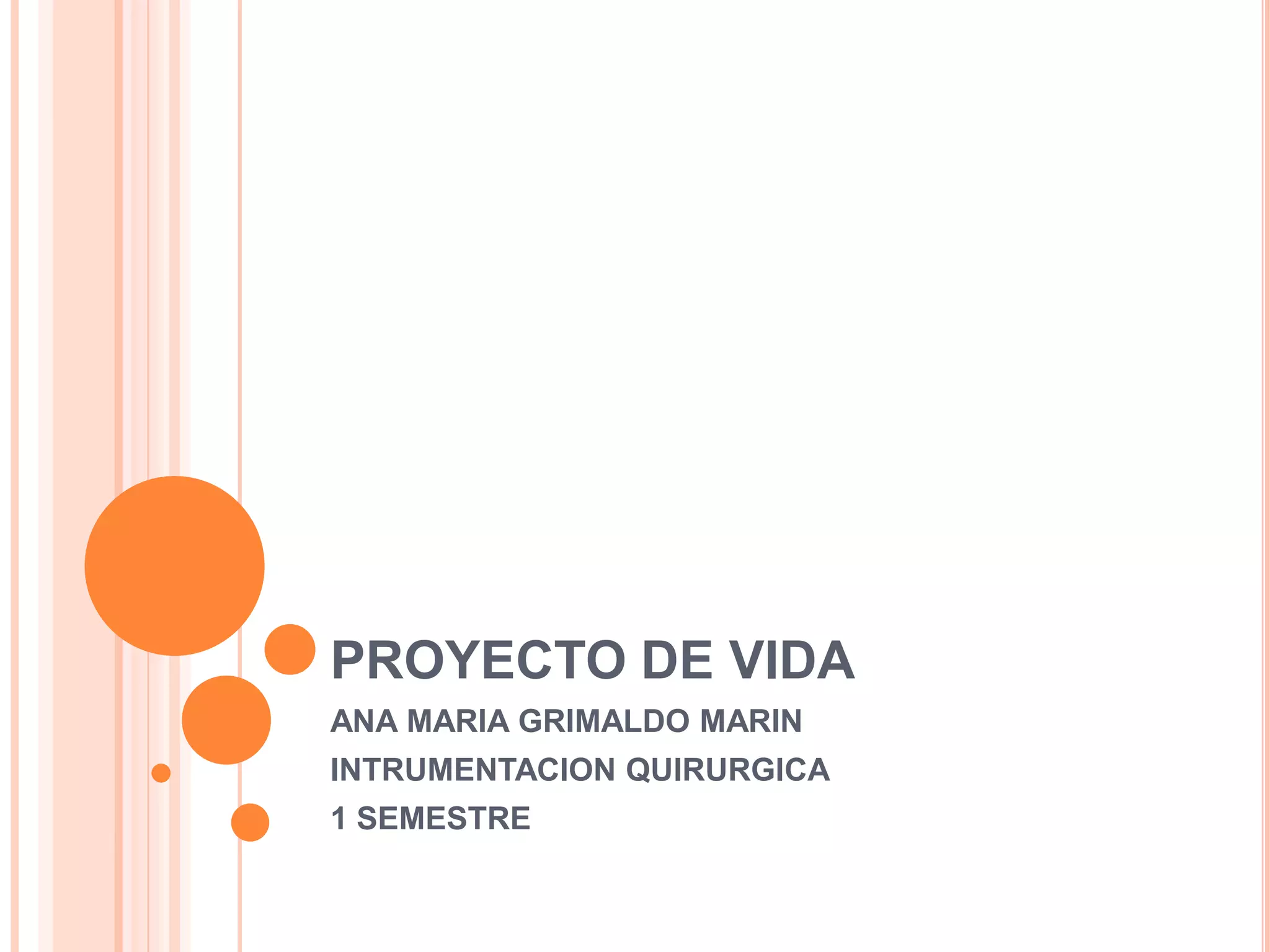 Ana María Grimaldo Marín está estudiando instrumentación quirúrgica en su primer semestre. Su proyecto de vida incluye su visión de convertirse en una profesional destacada en este campo para apoyar económicamente a su familia. Relata brevemente hitos en su vida como su nacimiento, estudios primarios y secundarios, el nacimiento de su hermano, y su situación actual como estudiante universitaria que vive con sus padres y novio.
