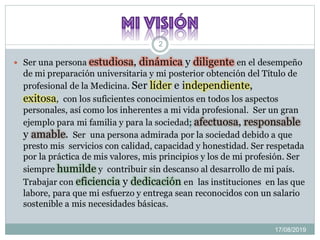El documento presenta la información personal y académica de Andrea Arias Ríos, quien está matriculada en el primer semestre de medicina en la Fundación Universitaria de Ciencias de la Salud. Detalla su árbol genealógico, su historial deportivo y académico, así como sus objetivos de desarrollarse personalmente, ayudar a otros a través de su conocimiento médico, y servirle fielmente a Dios.