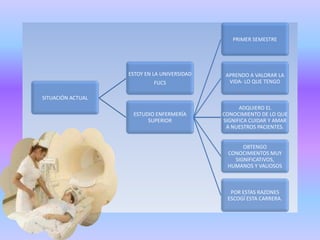 La autora expresa su visión de convertirse en una excelente enfermera superior con amplios conocimientos para brindar bienestar a la comunidad. Aspira viajar y prepararse intelectualmente para trabajar en un buen hospital en el futuro. Actualmente estudia enfermería en la Fundación Universitaria de Ciencias de la Salud porque desea apreciar la vida y comprender que la salud incluye el bienestar físico, mental y social, adquiriendo conocimientos humanos y valiosos sobre el cuerpo y la vida.
