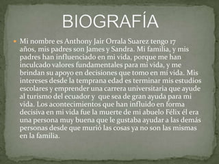 Este documento presenta una autobiografía de Anthony Jair Orrala Suarez, un joven de 17 años. Describe su familia, intereses y cómo la muerte de su abuelo afectó su vida. También detalla sus gustos y disgustos físicos, sociales, emocionales e intelectuales. Su visión es ser exitoso y contribuir al desarrollo de su país, y su misión es razonar para definir lo mejor para sí mismo y mejorar cada día. Su propósito de vida es ser profesional para ayudar a su país y tener una mejor cal