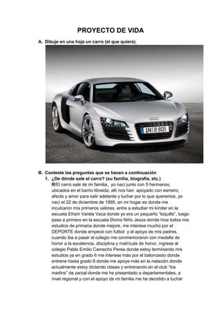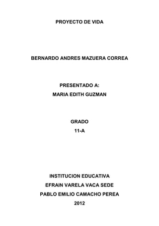 El documento presenta el proyecto de vida de Bernardo Andrés Mazuera Correa, un estudiante de grado 11. El proyecto describe su familia, educación, intereses en el deporte como el fútbol y la natación, y sus metas de terminar el bachillerato y estudiar educación física y kinesiología. También detalla los obstáculos que enfrenta como el vicio y problemas personales, y cómo los resuelve de manera pacífica. Su visión es ayudar a su familia y orientar a sus hijos mientras progres