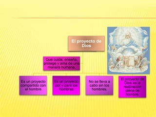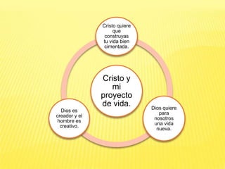 Este documento habla sobre el proyecto de vida como una herramienta para descubrir el sentido de la propia vida a la luz del proyecto de Dios. Explica que un proyecto de vida implica definir una visión personal del futuro, establecer una misión y construirla con amor incondicional. El proyecto de vida de Jesús se presenta como ejemplo para diseñar el plan de la propia vida y alcanzar lo que Dios quiere.