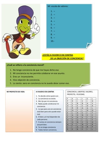 El documento aborda la búsqueda del ser humano por un proyecto de vida y la importancia de los valores en esta búsqueda, destacando que cada persona tiene su propia escala de valores que guía sus decisiones y busca la realización y la felicidad. Se reflexiona sobre la conciencia, diferenciando entre su dimensión psicológica y moral, y su papel en la toma de decisiones en relación con el bien y el mal. Además, se menciona la pluralidad de proyectos de vida en la sociedad y la necesidad de alinear la propia escala de valores con los valores enseñados por Jesús.
