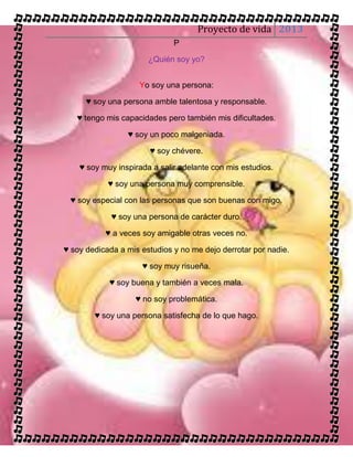 El documento presenta el proyecto de vida de Leidy Tatiana Rubio Sánchez, una estudiante de 13 años. Describe su personalidad, sus intereses que incluyen estudiar varias carreras y formar una banda de rock, y sus habilidades como el deporte, dibujo y natación. También menciona sus miedos a la oscuridad y los insectos. Su objetivo profesional es estudiar en las fuerzas armadas colombianas para ayudar a sus compatriotas y poder apoyar a su familia.