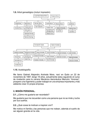 Este documento presenta la estructura de un proyecto de vida. Incluye una sección de autoconocimiento donde se describen los valores e intereses de la persona. La segunda sección presenta la misión personal, incluyendo factores motivadores y sueños. Finalmente, se describen estrategias y metas a cumplir para lograr los objetivos de convertirse en un profesional reconocido.