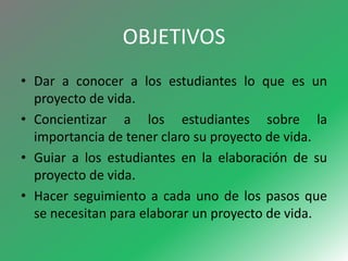 El documento presenta un proyecto escolar sobre la elaboración de proyectos de vida para estudiantes. El objetivo es enseñar a los estudiantes sobre la importancia de tener un proyecto de vida y guiarlos en su elaboración. Explica que un proyecto de vida describe las metas de una persona y es fundamental para tener un sentido de dirección. Además, provee instrucciones sobre cómo crear un proyecto de vida personalizado que incluya una autobiografía, análisis de la personalidad, y visión de cómo le gustaría ser en el futuro.