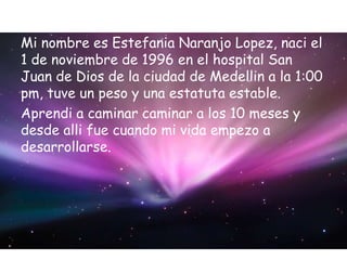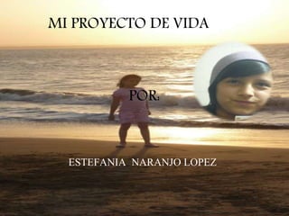 Estefania Naranjo Lopez narra su proyecto de vida desde su nacimiento en 1996 hasta sus 14 años. Describió sus etapas escolares desde el jardín infantil hasta el grado 9, incluyendo sus profesores y actividades extracurriculares como baloncesto, fútbol y patinaje. Actualmente cursa grado 9 y espera terminar el año con buen promedio para continuar su educación.