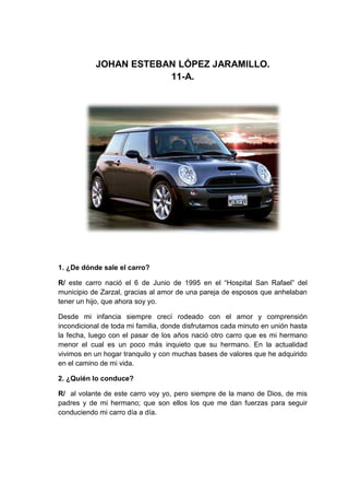 Este documento describe la vida de Johan Esteban López Jaramillo desde su nacimiento en 1995 en Zarzal hasta sus metas actuales de culminar sus estudios secundarios y estudiar ingeniería civil. Johan conduce su propia vida con la guía de su familia y de Dios, avanzando de manera constante pero serena hacia sus objetivos mientras enfrenta obstáculos como la inseguridad que busca superar siendo más seguro de sí mismo.