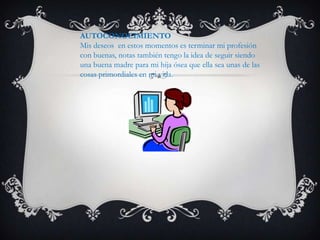 Johanna Paola Pérez de arco es una estudiante de 26 años de la carrera de Administración de Empresas en la Universidad de Cartagena. Actualmente no trabaja pero su objetivo es terminar sus estudios y conseguir un empleo para apoyar económicamente a ella y a su hija de 5 años. Sus metas a corto plazo incluyen participar más en clase, organizar mejor su tiempo y conseguir recursos económicos, y a largo plazo terminar su carrera, comprar una casa y formar una familia.