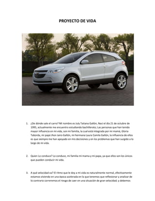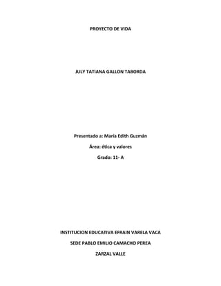 Este documento presenta el proyecto de vida de July Tatiana Gallón Taborda, una estudiante de grado 11. Ella describe su familia y las personas que más la han influenciado, como su mamá y papá. Su proyecto de vida incluye terminar el bachillerato, estudiar una carrera profesional, formar una familia con valores, y tener una casa propia. También menciona algunos obstáculos como el miedo al fracaso y que las cosas no salgan como planea, pero que los resolverá porque es dedicada y nunca se rinde.