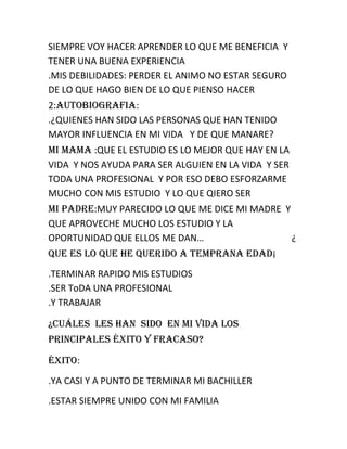 El documento presenta el proyecto de vida de Kelly Jhoana Bohorquez Garces, estudiante del programa Auxiliar Salud Oral. En él, Kelly describe sus fortalezas y debilidades, las personas que han influido en su vida como su madre y padre, sus logros y fracasos, sus sueños de convertirse en una profesional y ayudar a sus padres, y su plan de acción para aprovechar oportunidades y esforzarse para alcanzar sus metas a través de sus estudios.