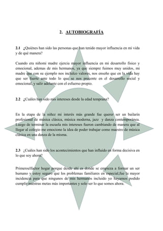 1. El documento presenta un plan de vida estratégico de una persona que incluye un análisis FODA, una autobiografía, rasgos de personalidad, objetivos y metas. 2. El individuo identifica sus fortalezas como su familia y habilidad para socializar, así como oportunidades constantes. Sus debilidades incluyen inseguridad y baja autoestima. 3. El plan de acción incluye estudiar marketing, ganar conocimientos y aprovechar oportunidades para lograr el objetivo de tener su propia empresa.