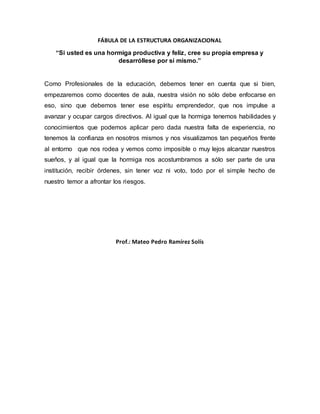 Este documento detalla un proyecto de vida centrado en la formación ética y profesional del autor, quien aspira a convertirse en un profesor destacado en los próximos tres años. Describe su contexto familiar y las motivaciones que lo impulsan, como el deseo de brindar un futuro mejor a sus hijos. Además, enfatiza la importancia del espíritu emprendedor en el ámbito educativo, instando a los docentes a superar sus temores y a buscar roles de liderazgo.