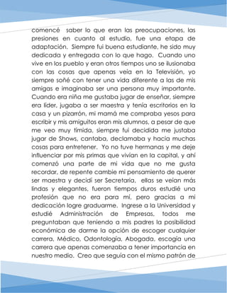 La autobiografía describe la vida de Juliargelia Viana Ramos. Nació en 1980 en Guatemala y creció en un pueblo con sus padres y dos hermanos. Se mudó a la capital a los 15 años para continuar sus estudios y se graduó de administración de empresas. En 2004 se casó y tuvo tres hijas. Actualmente vive en Jalpatagua donde trabaja en su propio negocio y en la universidad local.