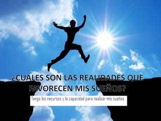 Este documento presenta una guía para establecer metas y sueños. Incluye secciones para describir la situación actual, fortalezas y debilidades, influencias formativas, sueños, obstáculos, y un plan de acción para superar impedimentos y lograr las metas a través de un programa de vida.