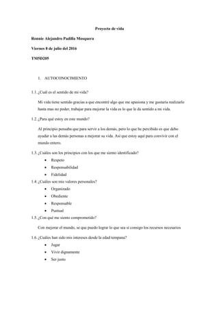 Este documento presenta el proyecto de vida de Ronnie Padilla. Incluye una sección de autoconocimiento donde explora sus valores, intereses e historia. Su misión es no ser una carga para la sociedad y contribuir al progreso de la humanidad. Sus objetivos incluyen convertirse en ingeniero y tener una familia estable. Su visión es trabajar independientemente y crear empleos. Su legado es que sea recordado por cómo era en vida.