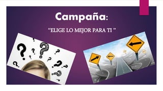 Este documento describe una campaña de orientación vocacional llamada "ELIGE LO MEJOR PARA TI". La campaña se llevará a cabo en el Liceo Francisco Henríquez y Carvajal y consistirá en dar charlas a los estudiantes de 4to grado sobre proyectos de vida y cómo construir el suyo propio. El objetivo es ayudar a los estudiantes a tomar decisiones informadas sobre su futuro y carrera basadas en sus intereses y habilidades. Las orientadoras de la escuela y el director serán los responsables de llevar a cabo las