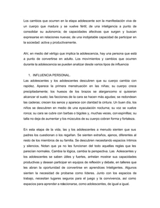 El documento describe los desafíos y cambios que enfrentan los adolescentes al convertirse en adultos, incluyendo la influencia personal, familiar y social. Los adolescentes deben tomar decisiones sobre sus valores, estudios y relaciones que afectarán su futuro, mientras transitan de una etapa dependiente a una autónoma. Es importante que reciban apoyo y orientación para enfrentar esta transición de manera armoniosa.